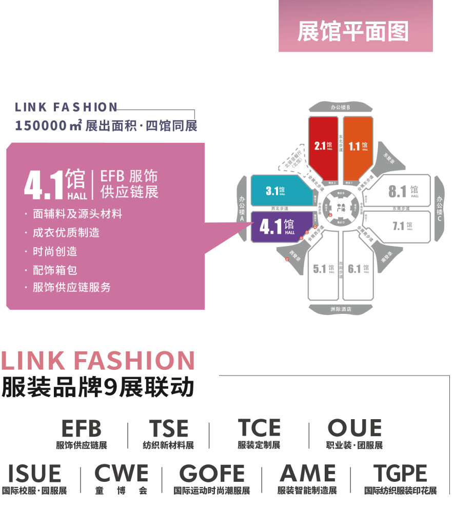 EFB服饰供应链展的展品品类全面,分区精细科学,2023年将紧跟市场动态,聚焦热门领域,全方位服务于服饰上下游供应链,对接服装全品类源头工厂,在展示新时尚的同时,业界优质企业同台竞技,推动产品创新及资源共享,为生产商、品牌商及贸易商等提供一个充分交流的平台。